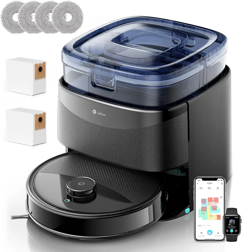 【Station d’autonettoyage tout-en-un】 Lefant M3 Max révolutionne la maintenance avec une automatisation complète : Automatisation 3 en 1 : ❶ Stérilisation à chaud à 45°C – Tue 99 % des bactéries. 2 heures de séchage à l’air frais – préserve l’intégrité de la fibre de la vadrouille. Bac mains libres de 3,5 L – Capacité de 8 semaines Système de nettoyage intelligent, contrôle intelligent de l’eau : empêche le sur/sous-mouillage. Brosse en V + peigne double : zéro enchevêtrement de cheveux.